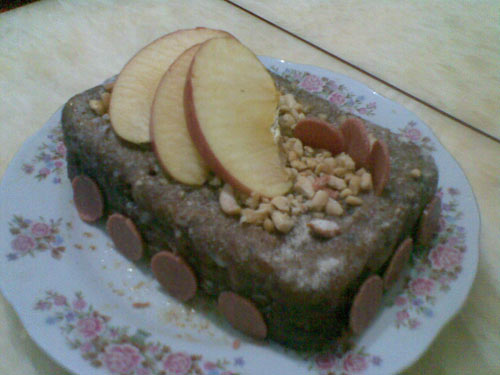 7、撒上些橙粉,碎花生,山楂片,再摆上几片苹果。呵呵,这蛋糕够山寨吧!(ps:要是有果酱之类的那就更好啦!)