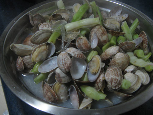 及以下步骤:关火,加入味精,出锅! 蛤蜊洗净备用 粉条用温水泡一会儿 蛤蜊洗净备用 粉条用温水泡一会儿 芸豆洗净掰开备用 锅内加少许油,放入大蒜爆香,加入芸豆煸炒 加入清水,粉条,盐(很少一点,因为蛤蜊有盐),开锅后煮一会。 芸豆断生后将蛤蜊放在顶部,盖锅盖,等待蛤蜊都开口就熟了,根据咸淡情况再次调味。 关火,加入味精,出锅!