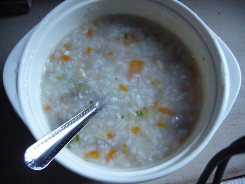 4、当粥熬成这样的时候就差不多好了,现在就把肉末倒下去,马上用勺子搅拌开,不然就是一团了!然后煮一分钟,就关火!