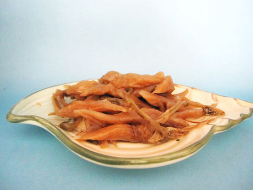 3、萝卜干斜刀切成小条。