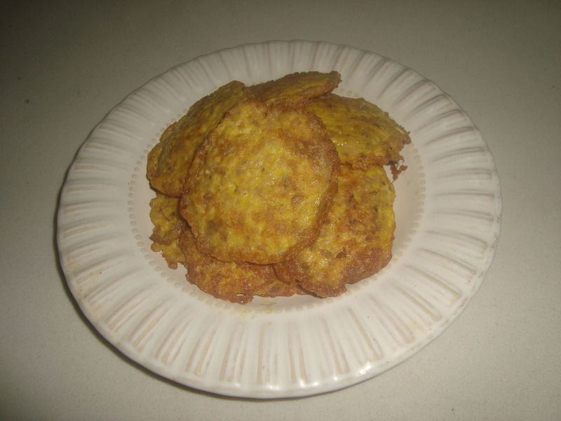 3、把菜脯蛋放到锅中煎,一面煎好翻另一面,移到锅边,再继续下一个。