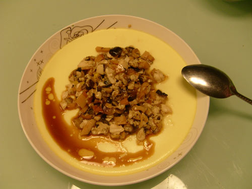 6、蛋羹出锅,放上炒好的三鲜料,趁热吃,一热胜三鲜