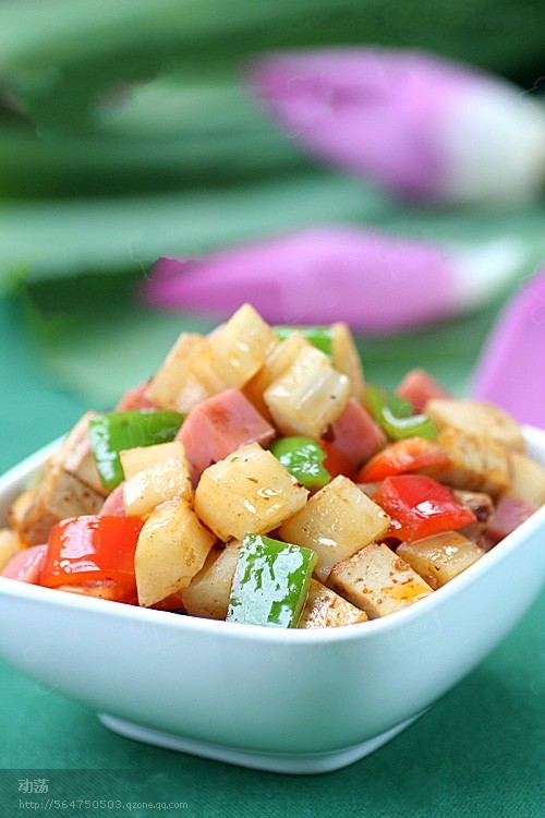 及以下步骤:炒锅烧热后倒入油,待油7成热时,倒入豆腐丁用大火煸炒1分钟,至豆腐丁表面成微黄色。倒入莲藕丁翻炒2分钟。 青红椒去蒂去籽洗净后切成丁。火腿切丁。豆腐干切丁。莲藕去皮洗净后切丁。 炒锅烧热后倒入油,待油7成热时,倒入豆腐丁用大火煸炒1分钟,至豆腐丁表面成微黄色。倒入莲藕丁翻炒2分钟。 青红椒去蒂去籽洗净后切成丁。火腿切丁。豆腐干切丁。莲藕去皮洗净后切丁。 炒锅烧热后倒入油,待油7成热时,倒入豆腐丁用大火煸炒1分钟,至豆腐丁表面成微黄色。倒入莲藕丁翻炒2分钟。 青红椒去蒂去籽洗净后切成丁。火腿切丁。豆腐干切丁。莲藕去皮洗净后切丁。 炒锅烧热后倒入油,待油7成热时,倒入豆腐丁用大火煸炒1分钟,至豆腐丁表面成微黄色。倒入莲藕丁翻炒2分钟。 青红椒去蒂去籽洗净后切成丁。火腿切丁。豆腐干切丁。莲藕去皮洗净后切丁。 炒锅烧热后倒入油,待油7成热时,倒入豆腐丁用大火煸炒1分钟,至豆腐丁表面成微黄色。倒入莲藕丁翻炒2分钟。 调入老干妈辣酱,酱油和盐翻炒均匀后,倒入火腿丁,青红椒丁,再继续翻炒1分钟即可。