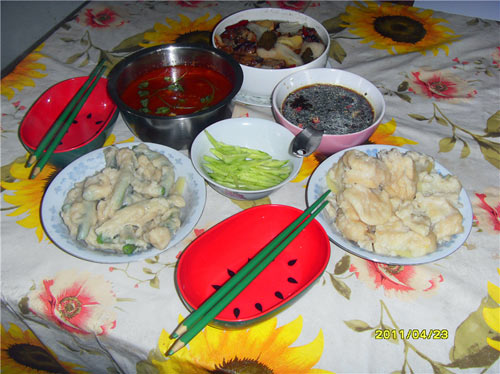 俗话说:中国面食在山西,山西面食属太原,能叫上的或叫不上名字的面食更是多得不胜枚举。沾片子是山西太原清徐县一带具有浓郁地方色彩的一款面食, 就是把蔬菜外面裹上面糊,然后煮熟了以后蘸着卤吃,吃法也很多。蔬菜一般是生菜、菠菜、白菜等,近来也有野菜做的。也可以用茄子、豆角、鲜蘑、土豆来做,口感会因材料不同而别具风味。沾片子的卤一般是西红柿酱、炸酱和醋调和三种。我个人比较喜欢豆角和土豆的,每次闻着就流口水,吃得是酣畅淋漓,欲罢不能,都吃撑了。