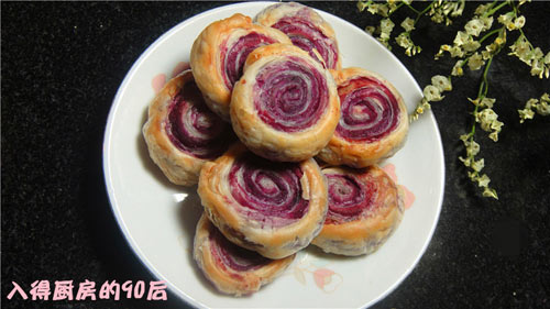 先请各位原谅我 帮这个小点心取了个这个复杂的名字哈。。脆皮 紫薯 年轮饼 这几个重点词汇都割舍不了,所以把它们串在一起了。。。嘿嘿。。 各位。。又见飞饼皮咯。。。像我这样的懒人,飞饼皮真的是再适合不过了。。。 这次是飞饼皮和紫薯的完美结合。。。又是我在厨房琢磨出来的(如有雷同 不胜荣幸。)。。。真的很漂亮呢。。 大家趁热吃哦。。。