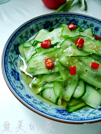 及以下步骤:黄瓜片加盐腌20分钟左右。 黄瓜清净切成断,用刨刀或用刀切成薄薄的片状。 黄瓜片加盐腌20分钟左右。 黄瓜清净切成断,用刨刀或用刀切成薄薄的片状。 黄瓜片加盐腌20分钟左右。 黄瓜清净切成断,用刨刀或用刀切成薄薄的片状。 黄瓜片加盐腌20分钟左右。 将黄瓜腌出的汁倒掉,姜切丝,蒜切片。 加生抽,白糖,醋,鸡精,姜丝,蒜片加入拌匀装入盘中,撒少许白芝麻。 热锅上油,将花椒炸香,挑出花椒后放入切小段的红辣椒关火,热油烧在撒了白芝麻的黄瓜片上即可。