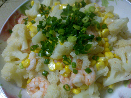 7、出锅上碟了哦!黄金(玉米)+珍珠(菜花)炒虾仁和各位分享哦。