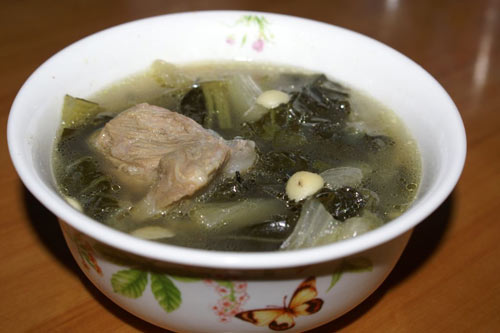 及以下步骤:然后转小火煲两小时左右即可。 菜干用清水泡开(大概泡半小时),要多清洗几次,这样才可以把夹杂的沙洗干净。 清洗干净的菜干,挤干水,切成小段。 菜干用清水泡开(大概泡半小时),要多清洗几次,这样才可以把夹杂的沙洗干净。 清洗干净的菜干,挤干水,切成小段。 南北杏也洗干净,备用。 砍好块的龙骨洗干净,锅中放水烧开,将龙骨放入煮出血水。 将菜干、南北杏放入汤煲中先煲开。 再将出过水的龙骨放入,再次煲开。 然后转小火煲两小时左右即可。