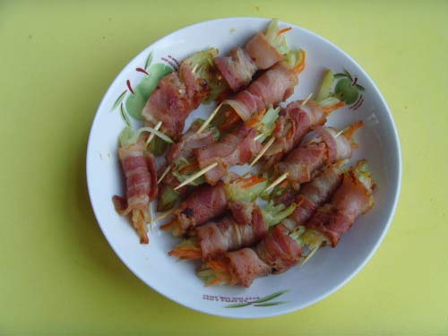 4、用培根将菜丝卷成卷。