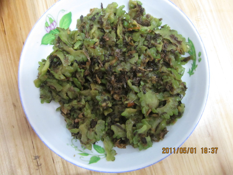 及以下步骤:苦瓜洗净切薄片后放盐腌制十五分钟左右 干酸菜洗净切碎 苦瓜洗净切薄片后放盐腌制十五分钟左右 干酸菜洗净切碎 苦瓜洗净切薄片后放盐腌制十五分钟左右 干酸菜洗净切碎 苦瓜洗净切薄片后放盐腌制十五分钟左右 干酸菜洗净切碎 干红辣椒可根据自己的口味选择放置 把腌好的苦瓜挤干水,锅里放适量的油,依次放酸菜,辣椒,苦瓜翻炒,因为苦瓜之前用盐腌制过,一般不需再加盐了,起锅前加入一点生抽。嗯嗯,开吃。