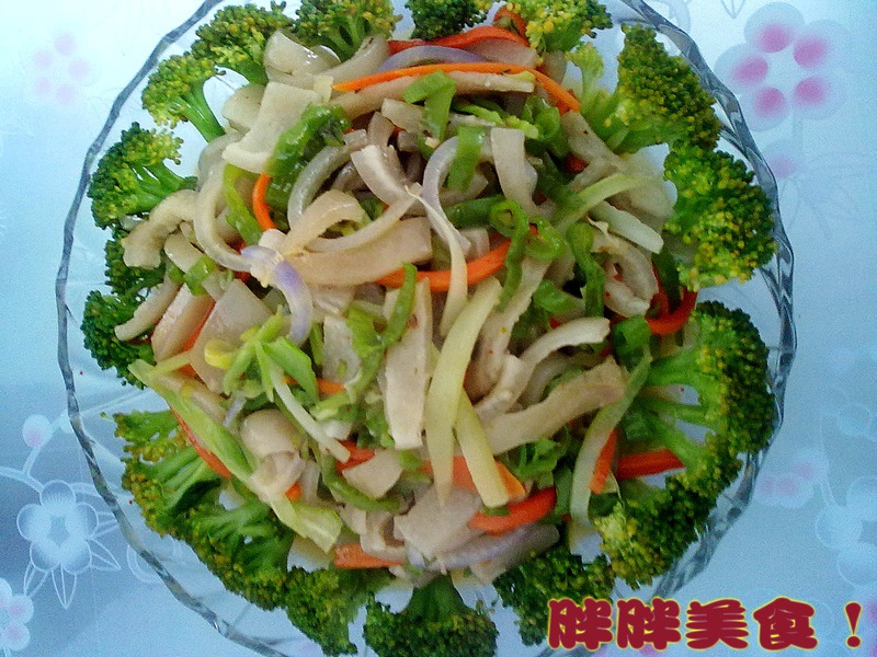 5、葱花炝锅,放入胡萝卜丝,西兰花丝,尖椒丝,翻炒2分钟,放入猪皮翻炒2分钟,放入盐和鸡精即可出锅。