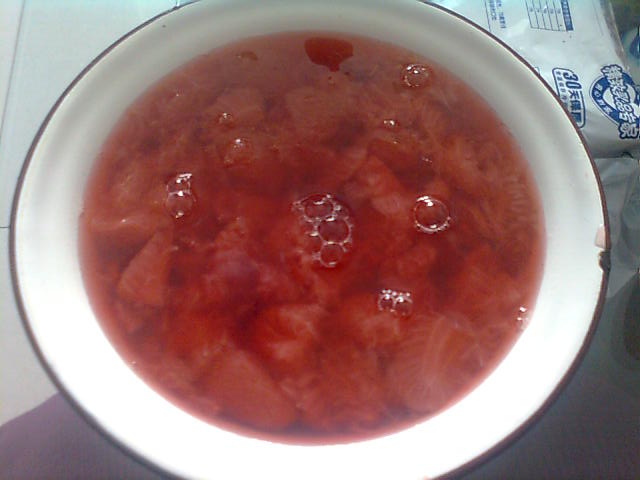 7、加白糖5~7勺,加水到高出草莓2cm处,然后适当搅拌。