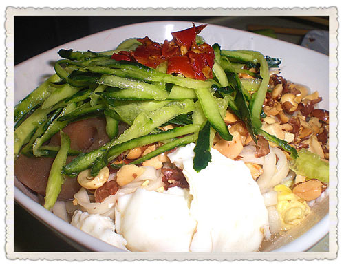 花生米(适量) / 黄瓜(适量) / 虾皮(适量) / 麻油(适量) / 辣酱(一小勺) / 骨头汤(适量)