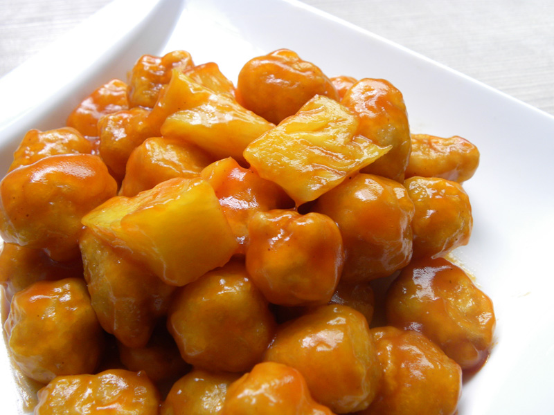 盐(适量) / 糖(适量) / 油(适量) / 淀粉(适量) / 白醋(适量) / 菠萝(50) / 番茄沙司(适量)