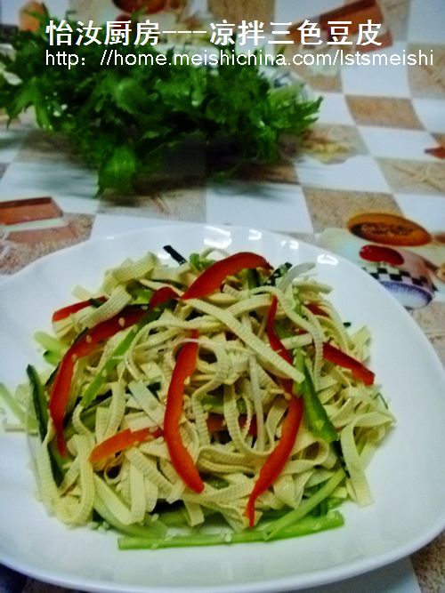 及以下步骤:凉拌三色豆皮主要食材 把各种食材都切成丝备用 凉拌三色豆皮主要食材 把各种食材都切成丝备用 凉拌三色豆皮主要食材 把各种食材都切成丝备用 把各种丝放入小盆中抓散或者拌散 放入香辣油、糖、鸡精在用碗把盐和糖弄成盐糖水 再把盐糖水倒入盆中搅拌均匀即可装盘 怡汝厨房