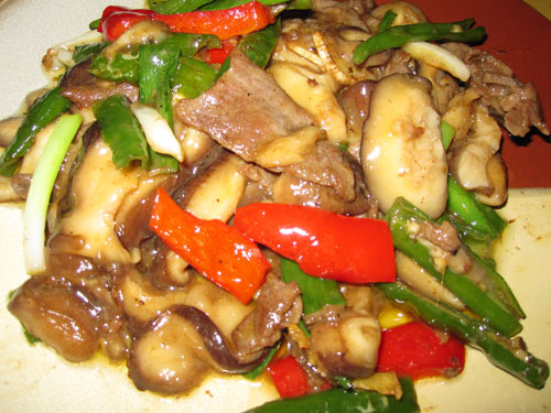 及以下步骤:牛肉洗净切片,加料酒.胡椒粉.淀粉及1勺清水拌匀后,加一点香油(或食用油)腌制20分钟。 香菇去蒂切片,辣椒切斜片,姜蒜切片,葱切段。 牛肉洗净切片,加料酒.胡椒粉.淀粉及1勺清水拌匀后,加一点香油(或食用油)腌制20分钟。 香菇去蒂切片,辣椒切斜片,姜蒜切片,葱切段。 牛肉洗净切片,加料酒.胡椒粉.淀粉及1勺清水拌匀后,加一点香油(或食用油)腌制20分钟。 香菇去蒂切片,辣椒切斜片,姜蒜切片,葱切段。 锅中倒油烧热,放入肉片看,快炒一下捞出。 锅中余油加热,爆香姜蒜片,放入香菇和辣椒炒匀。 加入牛肉片炒熟,加入盐.生抽.葱段炒匀。 起锅前加蚝油炒匀即可。