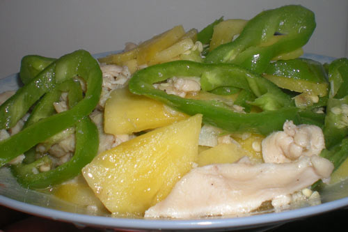 及以下步骤:加入青椒片,炒匀即刻关火。加入一滴香油拌匀出锅。 菠萝削皮后,用淡盐水浸泡5分钟 鸡胸肉切片,(肉先放冰箱冻一下比较容易切薄片) 菠萝削皮后,用淡盐水浸泡5分钟 鸡胸肉切片,(肉先放冰箱冻一下比较容易切薄片) 鸡柳用适量盐,胡椒粉,料酒腌制10分钟。 浸泡过的菠萝切片。 热锅放入适量食用油,爆香蒜片,将鸡柳放入炒至变色。 加入菠萝片翻炒至菠萝微微变软,有香味飘出。 加入青椒片,炒匀即刻关火。加入一滴香油拌匀出锅。