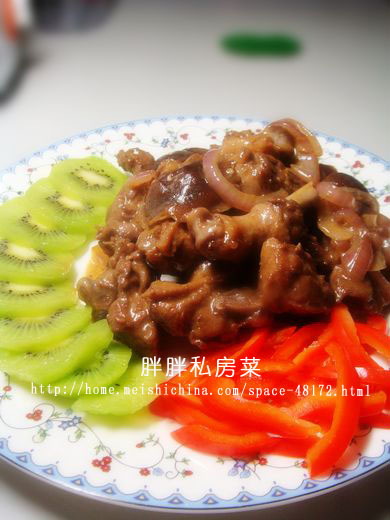 料酒(10毫升) / 味精(2克) / 葱(20克) / 姜(10克) / 油(30毫升) / 水淀粉(20克) / 洋葱(半个) / 香油(10毫升) / 蒜(8瓣) / 老抽(10毫升) / 花椒(5克) / 香菇(4朵) / 猕猴桃(1个) / 红酒(80毫升) / 彩椒(1个) / 盐 3克(适量)