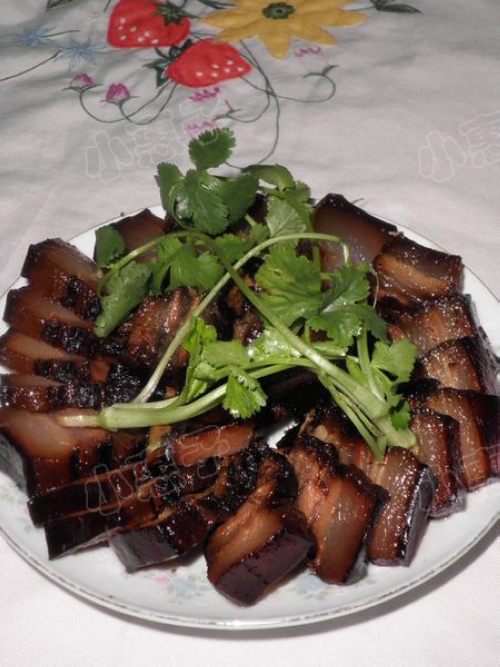 4、蒸好后取出,不烫手时,将腊肉切成薄片装入盘中,放上香菜就ok啦。