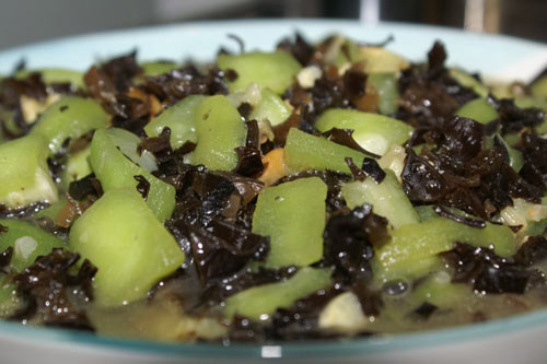 老爸今天拔牙了,因为怕吃硬的东西顶到伤口,于是我做了以下这道菜 -- 淡菜木耳烩丝瓜。还是头一回做的,没想到,味道还不错哟~吃的老爸都不觉得拔过牙的地方痛了,呵呵~