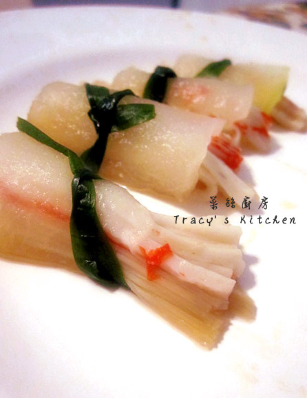 4、5.將蟹柳+金針菇捲入冬瓜,用韭菜葉輕輕扎好