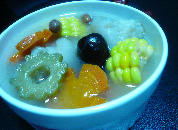 这道多味玉米猪脚汤,味道鲜美,营养丰富,加入玉米、苦瓜、胡萝卜、大枣、花生、枸杞与猪脚一起炖,闻起来香气扑鼻,喝下去唇齿留香,更重要的是能使皮肤变得光滑水嫩哦!