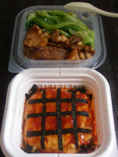 及以下步骤:将调好味的鱼茸及紫菜碎倒入饭锅里搅拌一起。 搅拌好的紫菜鱼茸饭。(若不打算做成蛋包饭便当,就这样搅拌好后既可享用了。有紫菜和香油盖住了鱼腥味。) 便当盒是方形的,所以准备了个方盒子,铺层保险膜垫底,紫菜鱼茸饭放进盒子按实成方形。 把煎好的蛋皮铺在碟子上,成型的饭团放在蛋皮上,包起来(我的蛋皮做的不好,又厚又小块,只能勉强包住饭的一面。) 包好的饭团置于便当盒里。(还好便当盒是方形的,蛋皮没能包住饭团,把没包好的饭团底部放进便当盒去,外面看来挺像样滴,没露馅)。 挤适量的番茄酱铺于蛋包饭上,以剩余的紫菜做个简单装饰就完成了。(本人手笨拙,装饰的难看,见谅~) 弄点小配菜,新鲜的白灼生菜和上次做的鲁肉排伴便当。看上去很丰盛了,这个便当变得有鱼有肉有紫菜还有肉呢。 包好的饭团置于便当盒里。(还好便当盒是方形的,蛋皮没能包住饭团,把没包好的饭团底部放进便当盒去,外面看来挺像样滴,没露馅)。 挤适量的番茄酱铺于蛋包饭上,以剩余的紫菜做个简单装饰就完成了。(本人手笨拙,装饰的难看,见谅~) 弄点小配菜,新鲜的白灼生菜和上次做的鲁肉排伴便当。看上去很丰盛了,这个便当变得有鱼有肉有紫菜还有肉呢。