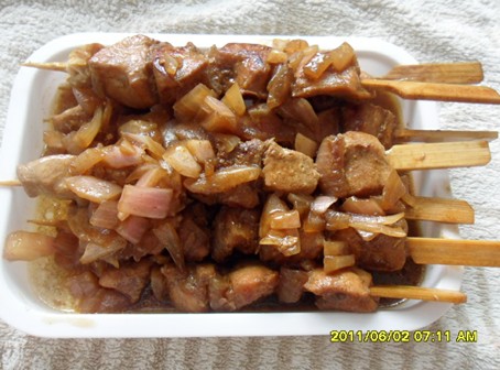 料酒(1小匙) / 盐(1小匙) / 酱油(一勺) / 洋葱(一个) / 蚝油(2小匙) / 蜂蜜(一勺) / 孜然(一勺) / 砂糖(2小匙) / 烤肉酱(适量) / 竹签(8根)
