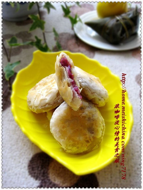 今天的粽子变身成酥皮火烧,外皮酥香,内馅微甜软糯,不是俺夸口,吃着真带劲。这个小饼对粽子没什么特殊要求,甜粽子、咸粽子、肉粽子只要是你喜欢的都可以,配料也可以依个人口味自由搭配。 我做的馅加了紫薯颜色很漂亮,花生糖粉和芝麻的加入令馅料超香,家人也说好吃,心里真是美呀~~