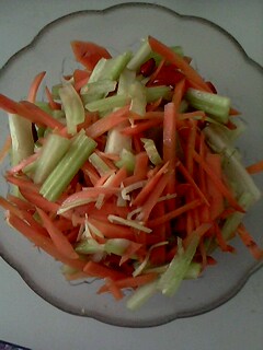 及以下步骤:7,把调料与青红丝拌开 8,装碗即可 1,胡萝卜切丝 2,西芹切丝 3,葱,姜,红辣椒切丝 4,烧开水把胡萝卜和西芹用开水稍烫一下 5,烫好后再用凉水冲一下 6,加入葱,姜,辣椒,麻油,盐,味精,醋,调味料 7,把调料与青红丝拌开 8,装碗即可
