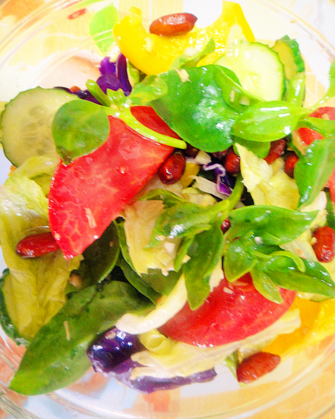 及以下步骤:把料汁拌入菜中,再做少量的炒菜油与香油的混合油,浇在拌好的菜上。 装在大玻璃碗中即可。 外面酷暑炎炎,餐桌上却是清清爽爽! 锅中做油把花生米小火炸熟,捞出备用。 西红柿和彩椒切大块儿。 把所以菜用盐水浸泡后洗净控水,装在一个大盆里,用手撕成大片。 调兑个凉拌料汁(放入生抽、醋、糖、盐、味精),把姜蒜末一并泡入混合均匀。 把料汁拌入菜中,再做少量的炒菜油与香油的混合油,浇在拌好的菜上。 装在大玻璃碗中即可。 外面酷暑炎炎,餐桌上却是清清爽爽!