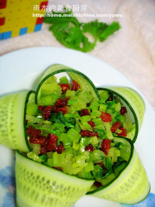 及以下步骤:番茄切碎。 西芹碎和叶,番茄碎加入盐,香油拌均匀。 腌10分钟后,倒入刚摆的黄瓜花中。 嫩芹叶用水焯下就捞出。 嫩芹用水焯下。 黄瓜条用手卷一下,摆成五个花瓣形。 嫩芹切碎。 番茄切碎。 西芹碎和叶,番茄碎加入盐,香油拌均匀。 腌10分钟后,倒入刚摆的黄瓜花中。