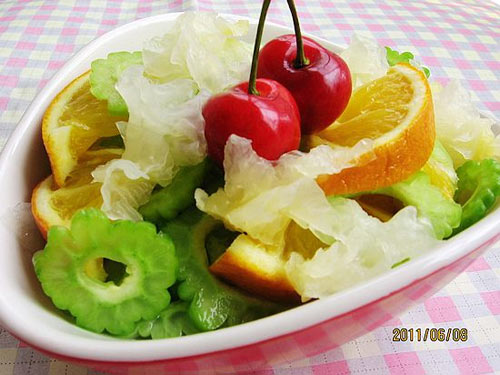 及以下步骤:苦瓜切成薄片后去瓤放到淡盐水中泡一会。 泡发后的银耳撕成小朵。 苦瓜切成薄片后去瓤放到淡盐水中泡一会。 泡发后的银耳撕成小朵。 苦瓜切成薄片后去瓤放到淡盐水中泡一会。 泡发后的银耳撕成小朵。 橙子洗净后连皮切成薄片,放入装了苦瓜与银耳的碗中。 加入一勺橄榄油。 加入蜂蜜和白醋。 调匀后加樱桃点缀,放冰箱冰镇一会再食用更佳。