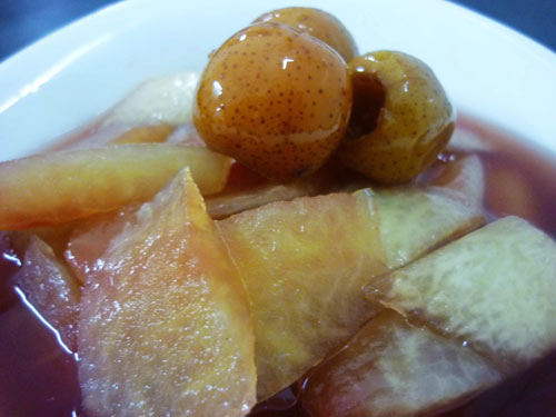 这款红酒山楂汁泡制的西瓜皮经过冰镇后,酸甜可口,可作为夏天的开胃小菜。