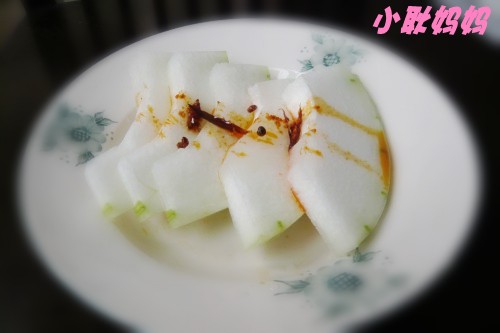 7、白醋加点调匀倒在冬瓜片上,最后淋上花椒油加可以。
