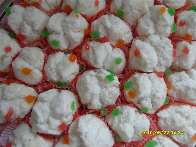 5、面粉2斤,醋40克,泡打粉40克,糖400克,奶400克,大油100克,蛋清4个,放在一起搅拌,旺火蒸10分钟,即成(这是60个的量)。