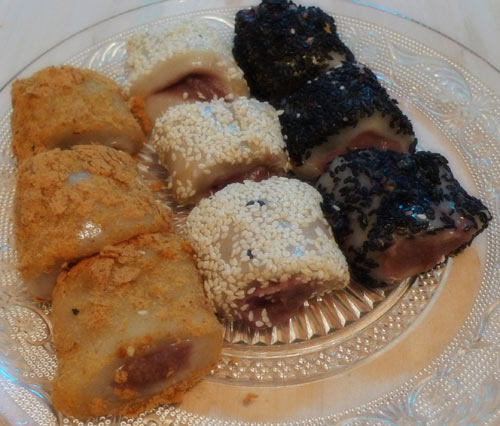 7、糯米粉100克,澄粉25克,糖30克,油35克,水150克。豆沙适量。