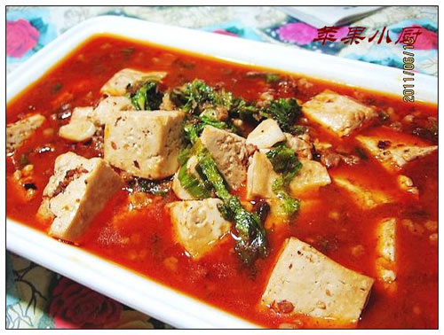 及以下步骤:锅中放油,爆香葱蒜末后加入肉末炒香至半熟。 豆腐切成方丁,在沸水里焯一下捞出。 锅中放油,爆香葱蒜末后加入肉末炒香至半熟。 豆腐切成方丁,在沸水里焯一下捞出。 锅中放油,爆香葱蒜末后加入肉末炒香至半熟。 豆腐切成方丁,在沸水里焯一下捞出。 锅中放油,爆香葱蒜末后加入肉末炒香至半熟。 加入老干妈牛肉辣酱、花椒粉、豆腐炒匀。 加入水、高汤精煮沸。 锅开后,继续煮几分钟,勾中薄薄的水淀粉、撒少许生菜丝点缀出锅。