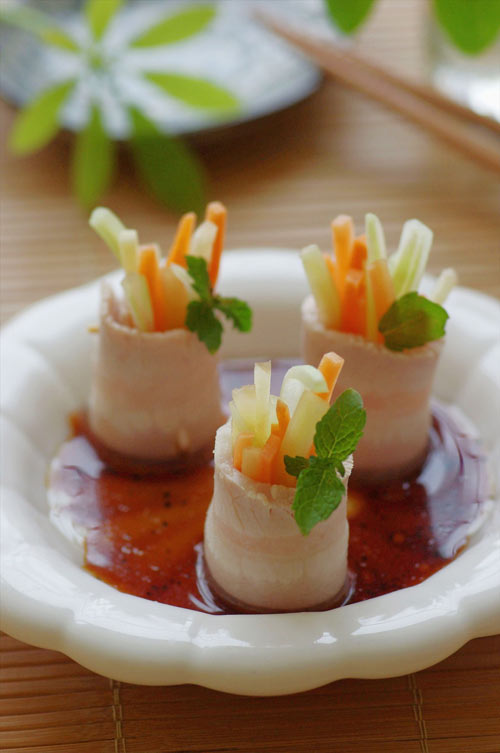 及以下步骤:锅中加冷水,放入洗净的五花肉,大火烧开后,撇去表面浮沫,盖上锅盖,转小火,继续煮30分钟左右。 煮熟的肉捞出,浸入冷水中。 锅中加冷水,放入洗净的五花肉,大火烧开后,撇去表面浮沫,盖上锅盖,转小火,继续煮30分钟左右。 煮熟的肉捞出,浸入冷水中。 锅中加冷水,放入洗净的五花肉,大火烧开后,撇去表面浮沫,盖上锅盖,转小火,继续煮30分钟左右。 煮熟的肉捞出,浸入冷水中。 待肉充分凉透后,取出沥干水分,切成薄片。 取一片肉,中央放上少许胡萝卜丝、莴笋丝和姜丝。 将肉片卷起,插上牙签定形,片刻之后将牙签去除。 将调料中的材料混合成为料汁,吃时蘸料汁即可。