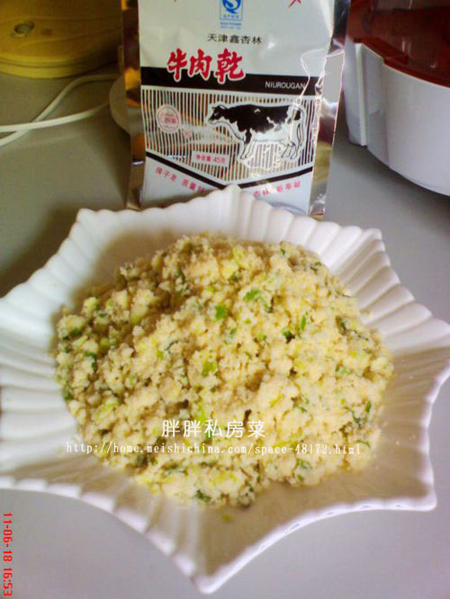 制作美食葱末豆腐渣。