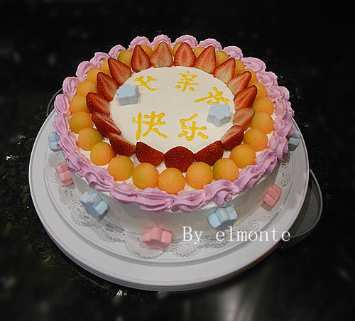 及以下步骤:用2把大菜刀把蛋糕移到蛋糕托板上。(尽量利用家里现有的器材,就不需要败太多的东西。) 剩余的奶油再次打发至硬性,滴入1滴紫色素,拌匀,装入裱花袋里,在蛋糕边上挤一圈花纹,放上水果和棉花糖装饰,用果胶写上“父亲节快乐”即完成了。 第一次写字,丑丑的。以前一直不敢在蛋糕上写字,怕影响美观,其实真正写了,感觉并不很难,多练练应该会好的。 鲜奶油加糖打至9分发。(我用的是动物性奶油,要加糖打,如果是植物性奶油就直接打发即可,因为已经含糖。) 取一片蛋糕抹上薄薄的奶油,撒上水果丁。 盖上另一片蛋糕,轻压一下。 倒入适量的奶油抹平。 用2把大菜刀把蛋糕移到蛋糕托板上。(尽量利用家里现有的器材,就不需要败太多的东西。) 剩余的奶油再次打发至硬性,滴入1滴紫色素,拌匀,装入裱花袋里,在蛋糕边上挤一圈花纹,放上水果和棉花糖装饰,用果胶写上“父亲节快乐”即完成了。 第一次写字,丑丑的。以前一直不敢在蛋糕上写字,怕影响美观,其实真正写了,感觉并不很难,多练练应该会好的。