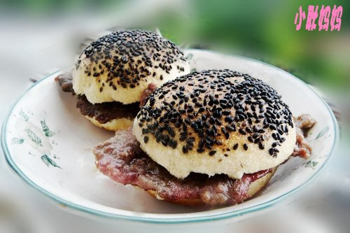 及以下步骤:蒸好的馒头用油炸一下,表面成金黄色就可以。 牛肉切成片,加盐,鸡精,葡萄酒,黑胡椒粉腌制入味后煎熟。 把馒头从中间剖开,夹上牛肉片就可以。 发好的面团分成大小差不多的剂子。 做成馒头形状。 在做好的馒头坯上刷一层水,撒上黑芝麻。 上笼蒸半小时左右,馒头就蒸熟了。 蒸好的馒头用油炸一下,表面成金黄色就可以。 牛肉切成片,加盐,鸡精,葡萄酒,黑胡椒粉腌制入味后煎熟。 把馒头从中间剖开,夹上牛肉片就可以。
