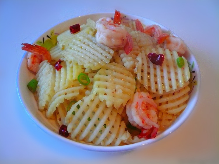 及以下步骤:土豆,洗净去皮。 用刀具切成镂空片。 土豆,洗净去皮。 用刀具切成镂空片。 土豆,洗净去皮。 用刀具切成镂空片。 干红椒、葱、姜炝锅,倒入虾与土豆爆炒。 我的午餐。 第二天还是老一套。 我的午餐。