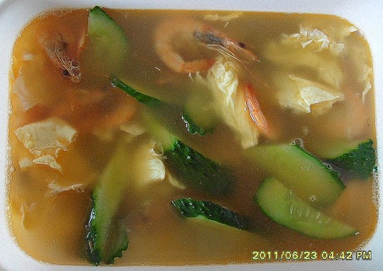 及以下步骤:放入黄瓜,1小勺盐,半勺鸡精,出锅! 又是虾,又是鸡蛋,又是黄瓜,营养全面啊!! 小虾活的,用水冲干净备用。(记得用盖子盖着,不然蹦的哪都是,还没做菜呢,还得先找到它们)呵呵。。 姜蒜切片后,倒少量的油爆香。 爆香之后倒入鲜虾翻炒,(虾倒入后记得马上盖锅盖啊,这有点残忍,因为1.虾会跳出来,2.是不忍心看啊) 虾炒香之后倒入1勺料酒翻炒,倒入开水。 鸡蛋1个打好,黄瓜切滚刀块。 水开倒入鸡蛋,等鸡蛋固定了再慢慢用铲子推推,不然就成蛋汤了。 放入黄瓜,1小勺盐,半勺鸡精,出锅! 又是虾,又是鸡蛋,又是黄瓜,营养全面啊!!