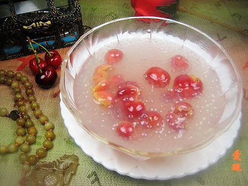 西米:西米有健脾,补肺,化痰的功效,有治脾胃虚弱和消化不良的作用;西米还有使皮肤恢复天然润泽的功能,所以西米羹很受人们尤其是女士的喜爱。 樱桃:樱桃含有维生素a、c、e、p,钙、铁、磷等矿物质,胡萝卜素,叶酸,蛋白质,糖等。樱桃的含铁量特别高,维生素a含量也很高,常食樱桃可促进血红蛋白再生,既可防治缺铁性贫血,又可增强体质,健脑益智。樱桃营养丰富,具有调中益气,健脾和胃,祛风湿的功效。常食樱桃可以美白,对头发也有健美功效。樱桃因含铁多,再加上含有一定量的氰甙,若食用过多会引起铁中毒或氢氧化物中毒。轻度不适可用甘蔗汁来清热解毒。樱桃性温热,热性病及虚热咳嗽者要忌食。
