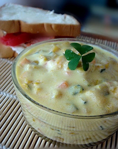 前几天冥想的芝士香浓南瓜汤终于变成现实了,俺娘不喜欢把南瓜变成泥,俺就全部切丁。 俺娘现在正在美美的吃着,还一个劲滴跟俺说:全是我的啊,你减肥呢,不能吃。 娘啊,俺真不跟你抢! 材料:南瓜粒(不去皮)、胡萝卜粒、牛奶、芝士片 用量:以个人口味和人数为准,按这个是俺娘的一人份 工具:电饭锅