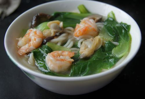 香菇(适量) / 青菜(适量) / 面条(适量) / 花蛤(适量) / 虾(适量)