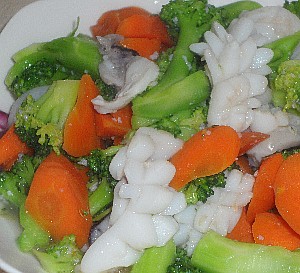 及以下步骤:墨鱼洗净切花刀,用蛋清浆一个多小时. 西兰花,胡萝卜洗净切小块用水氽一下. 墨鱼洗净切花刀,用蛋清浆一个多小时. 西兰花,胡萝卜洗净切小块用水氽一下. 墨鱼洗净切花刀,用蛋清浆一个多小时. 西兰花,胡萝卜洗净切小块用水氽一下. 锅内倒油烧至八成热 倒入墨鱼迅速划散炒出花盛出备用 锅内再加油加热后倒入西兰花和胡萝卜煸炒片刻 加入墨鱼翻炒后加盐,鸡精调味即可关火.