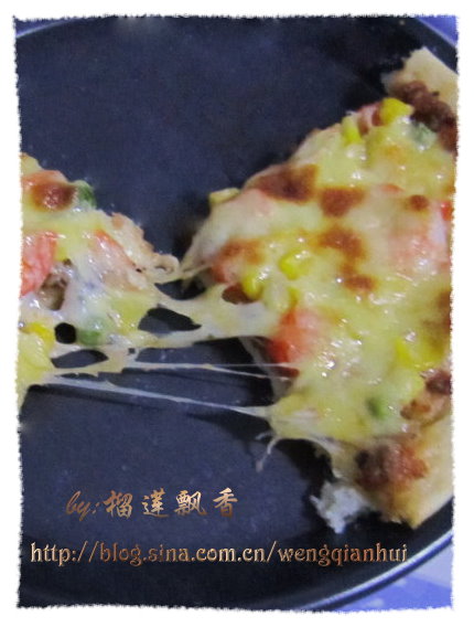 及以下步骤:醒发好的面团铺在比萨盘上,用手一边压一边向外推,压成薄厚均匀的面饼,与比萨盘相同大小。在面团底部用叉子叉一些小孔,防止烤的时候饼底鼓起来。制作好的饼皮如果不立刻烤焙,则要放入冰箱冷藏备用。 玉米粒、青豆、胡萝卜丁、鲜虾仁焯水,控干水份备用。 饼皮周围的一圈刷上一层融化的黄油或色拉油;在饼皮上铺一层比萨酱,均匀撒上一层比萨草,再撒上一层马苏里拉奶酪丝。 放入预热195℃的烤箱,中层,烤15分钟,取出,撒上剩下的马苏里拉奶酪丝,再放入烤箱烤5分钟至奶酪融化即可。 尝尝吧~~ 醒发好的面团铺在比萨盘上,用手一边压一边向外推,压成薄厚均匀的面饼,与比萨盘相同大小。在面团底部用叉子叉一些小孔,防止烤的时候饼底鼓起来。制作好的饼皮如果不立刻烤焙,则要放入冰箱冷藏备用。 玉米粒、青豆、胡萝卜丁、鲜虾仁焯水,控干水份备用。 饼皮周围的一圈刷上一层融化的黄油或色拉油;在饼皮上铺一层比萨酱,均匀撒上一层比萨草,再撒上一层马苏里拉奶酪丝。 放入预热195℃的烤箱,中层,烤15分钟,取出,撒上剩下的马苏里拉奶酪丝,再放入烤箱烤5分钟至奶酪融化即可。 尝尝吧~~