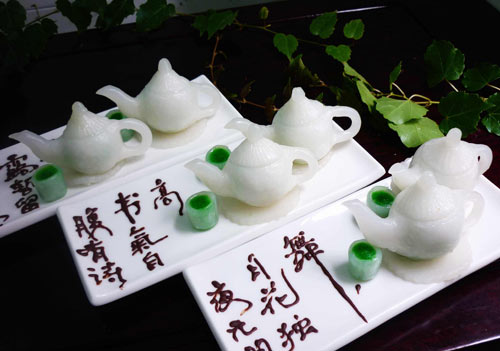 茶壶在船点中是比较难做的一种形状。做好的玉壶搭配巧克力书写的诗句,更能体现苏点的‘文气’。